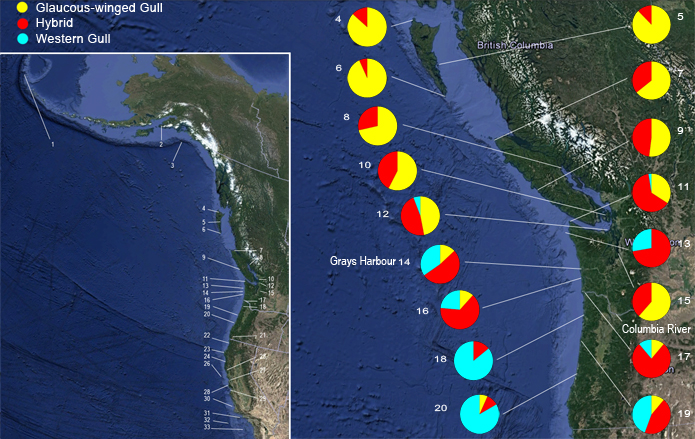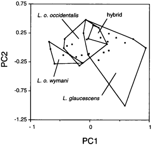 adult: JanuaryThe Condor 98:527-546, 1996 GENETIC DIFFERENTIATION, GEOGRAPHIC VARIATION AND HYBRIDIZATION IN GULLS OF THE LARUS GLAUCESCENS-OCCIDENTALIS COMPLEXDOUGLAS A. BELL (Museum of Vertebrate Zoology, University of California at Berkeley) INTRODUCTIONA central tenet of evolutionary biology is the origin of species through geographic subdivision of populations (Mayr 1963). Subdivision of populations into disjunct units spread out over great distances is thought to permit local differentiation via stochastic and deterministic processes that may lead to reproductive isolation and speciation (Endler 1977). When contact between divergent populations is reestablished, hybrid zones can form with resultant consequences for the evolutionary trajectories of the interbreeding populations (Barton and Hewitt 1989, Arnold 1993, Harrison 1993). For instance, if hybrid fitness is high, introgression can be extensive and the hybridizing populations may become panmictic over time, resulting in the formation of a hybrid swarm in place of the original taxa. Recent work in avian systems has shown that hybridizing taxa may experience bouts of gene exchange without becoming panmictic, especially if interbreeding is restricted in geographical or chronological scope (e.g., Parsons et al. 1993). Under such circumstances hybrid zones may function as conduits for gene exchange between species and thereby serve to increase overall levels of genetic and phenotypic diversity (Grant and Grant 1992, 1994, Moore and Price 1993, Parsons et al. 1993, Pierotti and Annett 1993). Clearly, such evidence has far reaching implications for biological species definitions because it suggests that the genetic systems of vertebrates may be prone to more introgression and lateral gene transfer than previously thought. Populations of large, white-headed Larus gulls provide an excellent system for the study of differentiation and introgression because hybridization occurs frequently within the genus (see Pierotti 1987). However, aside from the recent work of Snell (1991a, 1991b), nearly all previous gull hybrid zone research suffers from two major shortcomings: This paper presents a multidimensional approach to the study of hybridization between the Glaucous-winged Gull (Larus glaucescens) and the Western Gull (Larus occidentalis). Geographic variation in calorimetric (plumage and soft-part colors) and morphometric characters is assessed by univariate and multivariate statistical methods. Protein electrophoresis is used to investigate population genetic structure and gene Bow within the complex. The use of external characters to identify hybrids is tested and, following classification by canonical discriminant function analysis, interspecific genetic differentiation is assessed. Results from these analyses are used to infer the position of the hybrid zone and the evolutionary history of the Larus glaucescens-occidentalis complex. The breeding distribution of Larus glaucescens extends from the east coast of the Kamchatka Peninsula across the Aleutian chain and the Gulf of Alaska south through coastal British Columbia and Washington to northwestern Oregon (AOU 1983). Larus occidentalis breeds from Juan de Fuca Strait and the outer Washington coast south through Oregon, California and the west coast of Baja California (AOU 1983). The two species hybridize where their breeding ranges overlap along the Washington and northern Oregon coasts (Scott 1971, Hoffman et al. 1978). In addition, L. glaucescens hybridizes with the Slaty-backed Gull (L. schistasagus) on the Korjak shore of Kamchatka (Firsova and Levada 1982) and the Herring Gull (L. argentatus) in southern and southeastern Alaska (Williamson and Peyton 1963, Patten and Weisbrod 1974, Patten 1980). Larus glaucescens is also thought to hybridize with the Glaucous Gull (L. hyperboreus) along the eastern Bering Sea coast of Alaska (Strang 1977). Patten (1980) refers to L. glaucescens as a “key” taxon because it potentially links several of the northern Pacific Rim gulls. MATERIALS AND METHODSSAMPLING DESIGN AND ANALYSIS Field work was carried out from 1985 to 1990 during the breeding season in coastal Alaska, British Columbia, Washington, Oregon, California, and Baja California. Thirty-three “colony areas,” each including one or more collecting localities, was established throughout the allopatric and sympatric breeding ranges of L. glaucescens and L. occidentalis (Table 1, Fig. 1). Gulls were collected at nests or from sea or land points near colonies. Freshly collected birds were classified a priori in the field as either pure or hybrid based on general appearance in plumage and softpart coloration (see Hoffman et al. 1978). A total of 704 specimens of L. glaucescens, L. occidentalis, and their hybrids was collected, and an additional 58 specimens (wing preparations) were received on loan from the Burke Museum at the University of Washington. As a null hypothesis, all members of the Larus glaucescens-occidentalis complex were assumed to be invariant throughout their breeding range. Demonstration of significant geographic variation would lead to the rejection of the null hypothesis. In addition, the data were first analyzed under the assumption that each colony area was panmictic. Thus, no assumptions about taxonomic affinities were made, all specimens within each colony area were pooled, and the colony areas were analyzed population-by-population. This approach facilitated the testing of hypotheses concerned with overall variation in the complex, the shape of character clines, and HardyWeinberg equilibria within populations. Discriminant function analysis was then used to classify specimens to taxon (= morphotype) a posteriori. Each class of a posteriori-designated morphotype was then subjected to further analyses on intraspecific and interspecific levels.