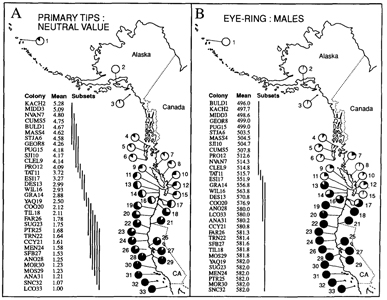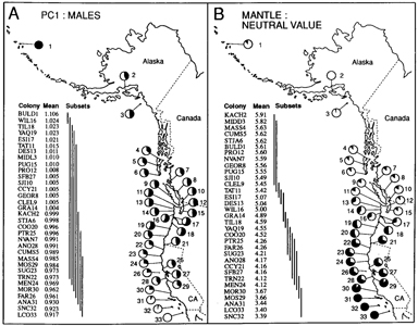 FIGURE 1. MORPHOMETRIC AND COLORIMETRIC ANALYSIS Mensural characters. Color characters. Each Munsell color is defined by three characters - hue, value, and chroma. From these, dominant wavelength (DW), percent spectral reflectance or brightness (Y), and excitation purity (PE), respectively, can be obtained with the aid of conversion tables (Munsell 1968). Newhall et al. (1943) and Bowers (1956) discuss the basis for these conversions. For examples on the use of Munsell color notations in avian systematic studies, see Hellack and Schnell (1977) and Smith (1987). Endler (1990) discusses the limitations inherent in color determinations based on visual inspection of color chip standards. Abbreviations for the soft-part calorimetric characters analyzed here are: PIP0 = proportion of iris covered in dark pigment; BIY = bill color, brightness; BDW = bill color, dominant wavelength; BPE = bill color, excitation purity; EY = eyering, brightness; EDW = eye-ring, dominant wavelength, EPE = eye-ring, excitation purity; E2Y = second eye-ring, brightness; E2DW = second eye-ring, dominant wavelength; E2PE = second eye-ring, excitation purity; IY = iris, brightness; IDW = iris, dominant wavelength; IPE = iris, excitation purity; PY = iris pigment, brightness; PDW = iris pigment, dominant wavelength; PPE = iris pigment, excitation purity. Numerical analysis. Prior to running statistical routines that are affected by scaling (see Sneath and Sokal 1973) mensural characters were log-transformed (Jolicoeur 1963) and calorimetric characters were standardized. Principal components analysis (PCA) of the variance-covariance matrix of 11 log-transformed mensural characters was used to summarize variation across all characters (SASPRINCOMP). Canonical discriminant function analysis (DFA) of calorimetric characters was employed to classify specimens into three groups separated by sex: putative L. glaucescens, L. o. occidentalis, and hybrids. The southern Western Gull, L. o. wymani (MOS29-LC033), was not included in the DFA. To calibrate the DFA, specimens collected from largely allopatric colonies were designated pure. Thus, specimens from BULD1 to STJA6 (see map, Fig. 1) were used to represent L. glaucescens, while those collected from colonies COO20 to AN028 represented L. o. occidentalis. Specimens collected from colony areas NVAN7 to YAQ19 were assigned to the hybrid calibration data set after removal of specimens considered to be putatively pure, based on a priori assumptions of plumage and soft-part color variation. To obtain a posteriori classifications, all specimens from colonies BULD1 through AN028, separated by sex, were then subjected to linear DFA (SAS-DISCRIM) using the pooled covariance matrix of Euclidean distance values calculated from the two plumage and 16 soft-part calorimetric characters described above. Calculating the a posteriori error rate probability permitted the classification of specimens of questionable pure or hybrid status. ALLOZYME ELECTROPHORESIS Sample preparation and laboratory procedures. Numerical analysis. Genetic substructuring of populations was investigated using F-statistics (Wright 1978, Nei 1977) and principal components analysis (Barrowclough and Johnson 1986). In the latter analysis, allellic frequencies of seven of the “most variable” loci (EST-2abc, EAP-1a, LAa, PAPab, MDPHab, G3PDHab, PGM-1a) at all 33 colonies were arcsine transformed before subjecting the resulting variance-covariance matrix to PCA. The genetic distance measures of Nei (1978) and Rogers (1972) were used to assess divergence between colony areas and taxa. Phenetic clustering of taxa based on genetic distance was accomplished using the unweighted pair-group method with arithmetic averaging (UPGMA; see Sneath and Sokal 1973). Quantitative estimates of gene flow were obtained using FST, a measure of intercolony variation in allele frequency averaged across all alleles, loci and colonies, to estimate Nm from the formula developed by Wright (1951): Nm = (1/FST - 1)/4, where N is the number of individuals in a population and m is their migration rate (individuals per generation). This formula assumes an infinite island model of population structure at equilibrium and neutral allelic variation (Wright 1951). MORPHOMETRIC AND COLORIMETRIC RESULTSMORPHOMETRIC VARIATION MANOVA revealed that all 11 mensural characters in the L. glaucescens-occidentalis complex are significantly sexually dimorphic, with males being on average 6-13% larger than females (Bell 1992). Mensural variation was therefore analyzed separately by sex. The 11 log-transformed mensural characters loaded positively on PC1 and variably on PC2 for each sex in the PCA (Table 2). This pattern of character loading implies that PC1 scores summarize mostly sizerelated variation, whereas PC2 scores summarize both size and shape variation (Marcus 1990). In both sexes, the total variance explained in the PCA is greater for PC1 than PC2 (Table 2). Plots of PC1 versus PC2 showed extensive overlap between morphotypes in the complex (Bell 1992). The SS-STP identified eight subsets of maximally non-significant means for male PC1 scores (pooled taxa), showing that although this multivariate measure of size varies within the complex, no pattern of significant clinal variation is evident due to extensive overlap of colony means (Fig. 2). Within the complex, however, males from the Aleutians Islands (BULD1) tend to be the largest, whereas those from the Channel Islands off southern California and Baja California (ANA31 to LCO33) tend to be the smallest. Females exhibit a smiliar trend in PC1 scores (Bell 1992). Univariate mensural characters, such as head, wing, and tarsus length, revealed similar patterns of variation in size in both sexes (Bell 1992). Extensive overlap between morphotypes of the L. glaucescens-occidentalis complex in British Columbia, Washington and Oregon, precluded using morphometric characters to discriminate hybrids from pure parenta