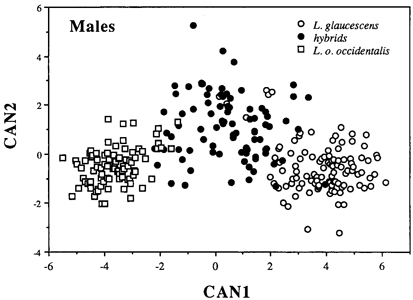 FIGURE 2. COLORIMETRIC VARIATION Results from the MANOVA revealed that one or more characters related to either bill, eye-ring, or iris color were sexually dimorphic (Bell 1992). As Pierotti (pers. comm.) pointed out, the bills of females appear “richer”, less “faded” in color than those of males. Males and females did not differ significantly in their respective distributions of neutral values for the mantle (Kolmogorov-Smirnov two sample test, D = 0.029, P > 0.05) and primary tips (K-S two-sample test, D = 0.069, P > 0.05). Therefore, the sexes were combined to study geographic variation in the population means of these two characters. Results from the SS-STP applied to colony means (pooled taxa) for mantle neutral value reveal significant clinal variation with latitude (Fig. 2), ranging from dark gray (mean = 3.39) at SNC32 in southern California to light gray (mean = 5.91) at KACH2 in Kachemak Bay, Alaska. Steps in colony means for mantle neutral value occur both within and between taxa. In L. o. wymani, gulls from the Channel Islands (LCO33 - AN030) have darker mantles than those from the central California coast (MOR30-MOS29). Another step in mantle neutral value occurs between L. o. wymani (MOS29) and L. o. occidentalis (AN028). From AN028 to CCY21, a region corresponding to pure L. o. occidentalis, mantle color remains fairly constant, but then increases in value, e.g., becomes lighter, in Oregon (CC020 to TIL18), due in part to the presence of hybrids and some L. glaucescens, but also due to clinal variation in L. o. occidentalis. For example, specimens of putatively pure L. 0. occidentalis from Washington and Oregon have significantly lighter mantles than those from northern California (WA & OR: MANTmean = 4.50; n = 75; CA: MANTmean = 4.18; n = 133; two-tailed ts = 11.45; P < 0.0001). Mantle color goes through an inflection point in colonies at the Columbia River and along the outer Washington coast (ESI17, WIL16, GRA14, DES13). These four colonies are included in the main region of sympatry. North of this zone, from TAT11 at the entrance to Juan de Fuca Strait to MASS4 in the Queen Charlotte Islands, and east into Puget Sound (PUG15) mantle color is substantially lighter, but relatively constant in mean colony value. A further step towards lighter mantle neutral values occurs between British Columbia (MASS4) and Alaska (MIDD3). Note that colony means for mantle color at STJA6 and BULD1 are nearly identical (Fig. 2). These colonies are at approximately the same latitude (52”) on opposite sides of the Pacific. Thus, Larus glaucescens may exhibit parallel latitudinal clines in mantle color along both eastern and western coasts of the northern Pacific Rim, although in the eastern Pacific introgression from L. schistasagus may also be influencing mantle color. Similar to the mantle, colony means (pooled taxa) for primary tip neutral value exhibit significant clinal variation (Fig. 3), ranging from near-black (mean = 1.00) at LCO33 to light gray (mean = 5.28) at KACH2. Steps in primary tip melanism occur at approximately the same geographic positions as in the mantle, and colony mean subsets appear to reveal an inflection point concordant with the concentrated region of sympatry on the outer Washington Coast (ESI17, WIL16, GRA14, and DES13). As in the mantle, primary tip melanism shows intraspecific clinal variation: a posteriori identified specimens of L. o. occidentalis from Washington and Oregon have significantly lighter primary tips than those from northern California (WA & OR: TIPmean = 1.96; n = 75; CA: TIPmean = 1.64; n = 133; two-tailed t, = 10.36; P < 0.0001). The dominant wavelength (DW) of eye-ring color showed little geographic variation within putative taxa for either sex (Fig. 3). Although most gulls possessed one pigment, either yellow (DW = 575-582 nm), as in L. occidentalis, or pink (DW = 493-5 10 nm), as in L. glaucescens, some of the hybrids possessed both pigments (yellow and pink). It was therefore necessary to calculate an average for each gull to account for double pigments. In both sexes colony means for average eye-ring DW undergo a jump in the space of 90 km along the outer Washington coast: that is, between DES13 (47”41’N) near La Push and TAT11 (48”23’N) near Cape Flattery. Eye-ring DW demarcates a main contact boundary between L. glaucescens and L. o. occidentalis. FIGURE 3. FIGURE 4. DISCRIMINANT FUNCTION ANALYSIS Canonical DFA using 18 calorimetric variables provided significant discrimination of putatively pure and hybrid gulls of both sexes. Because the results are nearly identical in both sexes, only males are illustrated (Fig. 4). The first canonical variate (CAN1) separated all three categories of gulls - L. glaucescens, L. o. occidentalis and hybrids - and accounted for 92.8 and 93% of the within-class variance in males and females, respectively (Table 3). The second canonical variate (CAN2) provided additional discrimination of some hybrids. Hybrids are clearly intermediate in canonical multivariate space between L. glaucescens and L. o. occidentalis, although the DFA provided better separation between hybrids and L. o. occidentalis than between hybrids and L. glaucescens (Fig. 4). Character loadings on each canonical axis signify the relative contribution of the character towards total canonical structure (Marcus 1990). Although most colorimeteric characters had high loadings on CAN1 and intermediate loadings on CAN2 (Table 3), some may serve as better discriminators than others. In both sexes, MANT and TIP load heaviest on CAN1 (r >= 0.90) suggesting that these two characters contribute the most toward discriminating between L. glaucescens, L. o. occidentalis and hybrids. In males, BDW also loads highly on CAN1. THE HYBRID ZONE Based on the a posteriori classification of specimens from the DFA, the hybrid zone between Larus glaucescens and Larus occidentalis is defined here to include all colonies where both species were col