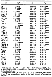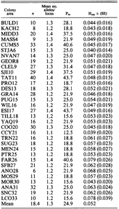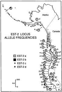 GENETIC RESULTSGENETIC VARIABILITY Of 32 loci scored across 33 colony areas (pooled taxa) within the Larus glaucescens-occidentalis complex, 25 (78%) were polymorphic. Of the polymorphic loci, 14 had two alleles each, 10 had three alleles, and one locus had four alleles. Seven loci were monomorphic (AAT-2, GDA, GPI, GTDH, MDH-2, SOD-1, and SOD-2). The mean number of alleles per locus-colony area ranged from 1.4 to 1.1 and tended to be lower in colony areas south of the hybrid zone, i.e., south of COO20 (Table 4). Percent polymorphism (P) ranged from 12.5% at a L. o. occidentalis colony in northern California (CCY21) to 43.7% at two colonies within the hybrid zone (TAT11 in Washington and ESI17 in Oregon). Observed heterozygosity (H) ranged from 0.035 at PRO12 in Washington to 0.079 at FAR26 in California. GEOGRAPHIC VARIATION The EST-2 locus illustrates a typical pattern of allelic variation in the Larus glaucescens-occidentalis complex (Fig. 5). In EST-2, the “a” allele is found in all populations, but tends to be fixed in northern colonies and decreases in frequency southwards. The EST-2b allele varies in a mosaic-like fashion across all colonies, but tends to increase in frequency southwards. The EST-2 allele is a rare allele found in four colonies in the hybrid and introgressive zones (SJI10, TAT11, DES13, and PUG15). A rare allele is defined here as an allele that is found in one or more, but not all, colonies (see also Slatkin 1985). Another rare allele, EST-2d, appears only at MIDD3 (L. glacescens). Allelic frequency differences between colonies were not great enough to demarcate exact geographic limits for the hybrid and introgressive zones. Principal components analysis of allelic frequency variation across all 33 colonies with morphotypes pooled indicate that colonies containing L. glaucescens occupy more multivariate space than those containing L. o. occidentalis, implying that L. glaucescens is genitally more variable than the other members of the complex (Fig. 6). Note that colonies containing more than 50% hybrids fall within the multivarite space of both putative parentals. The presence of rare alleles may indicate hybridization-induced variability (Woodruff 1989). Grouping colony areas into regions based on their relationship to the hybrid zone revealed that the average number of rare alleles per colony differed significantly between regions (F = 3.97, P = 0.029, df = 2, 30). Colonies in Alaska, British Columbia, and Washington (BULD1 to SJI10, plus PUG15) averaged 3.82 rare alleles per colony, colonies in the hybrid zone in western Washington and northern Oregon (TAT11 to COO20, excluding PUG15) averaged 2.44, and south of the hybrid zone, in pure L. occidentalis colonies (CCY21 to LCO33), the average was 1.15 rare alleles per colony. A general trend of increasing allelic diversity from one region of parentals (L. occidentalis) through the hybrid zone into the other region of parentals (L. glaucescens) suggests that introgression is unidirectional, in this case, directed towards L. glaucescens. GENETIC POPULATION STRUCTURE AND GENE FLOW Rogers’ (1972) and Nei’s (1978) genetic distance measures revealed low overall intercolony distances (data in Bell 1992; tables of intercolony genetic distances are available from the author). Roger’s D ranged from 0.007 (e.g., between TIL18 and MEN24) to 0.076 (between BULD1 and SNC32), and averaged 0.029 across all colony areas. Nei’s D showed similar patterns, but lower overall values. The mean intercolony genetic distance was 0.003, and ranged from 0.000 (between KACH2 and MIDD3) to 0.028 (between BULD1 and SNC32). Across all 33 colony areas with taxa pooled, single locus estimates of Fst were low, but significant, for 18 of 25 polymorphic loci, and Wright’s Iilsr a measure of potential inbreeding within populations (Wright 1951, 1965), was significantly greater than zero at seven loci (Table 5). Thus, although mean FST for all loci implies that only 8.2% of the total genetic variance is distributed among populations (Table 6), the L. glaucescens-occidentalis complex does not appear to be panmictic. Restricting the F-statistical analysis of colony areas with taxa pooled to most of the hybrid zone increases mean Fis from 0.032 to 0.099 (Table 6), suggesting that inbreeding is higher in mixed-taxon colonies within the hybrid zone than in single-taxon colonies outside of the hybrid zone. The estimated number of immigrants per colony generation (Nmest) for pooled taxa is 2.80. This value is consistent with moderately high rates of gene flow and agrees with low, yet significant, levels of overall genic heterogeneity among colonies. Chi-square goodness-of-fit and exact significance probability (Haldane 1954) tests detected departure from Hardy-Weinberg in several loci and colony areas (Table 7). Of these, the PAP locus was deficient in heterozygotes at three hybrid zone colonies (TAT11, GRA14, ESI17) and one L. o. occidentalis colony (CCY21). Although one or two departures may be expected due to chance (Cooper 1968), four significant departures from Hardy-Weinberg, three of which are in the hybrid zone, implies that mixed-taxon colonies are themselves not panmictic. Within the hybrid zone, the PAP aallele differs in frequency between L. glaucescens and L. o. occidentalis by 27% (Bell 1992), an amount which suggests that mating between the two taxa is not random, or at the very least, that gene flow between them is restricted. INTERSPECIFIC GENETIC DIFFERENTIATION There were no fixed allelic differences between a posteriori-classified taxa of the L. glaucescens-occidentalis complex, that is, they all shared at least one allele per locus (data in Bell 1992, tables of allelic frequency data are available from the author). Although heterozygosity is highest in L. o. wymani, L. glaucescens appears to be the most variable gull in the complex because it has the highest average number of alleles per locus and the greatest percent poly