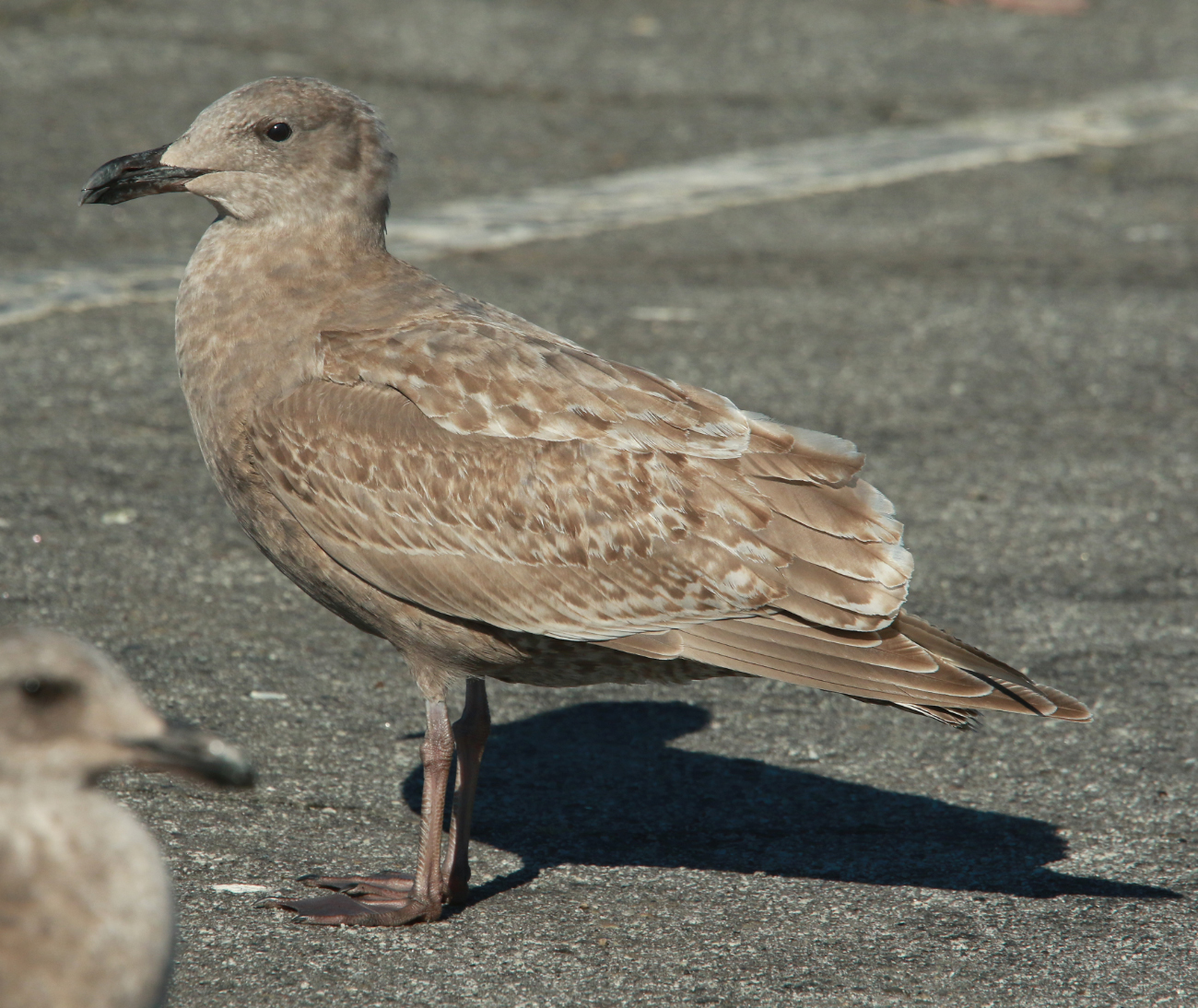 Some upper scaps replaced, lower scaps still juvenile. The brown tone on the outer primaries together with the hefty black bill may indicate some heritage from Western Gull occidentalis? See BELL'S PAPER.