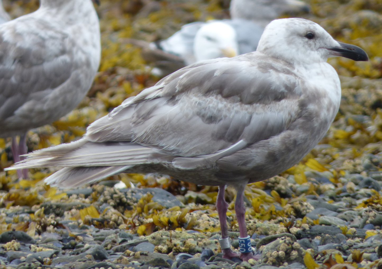 Blue band: letter digit digit. Data pending, probably banded as pullus in July 2015, at Valdez-Cordova Census Area, Alaska. If so, then gull was too young to fly when banded in 2015.