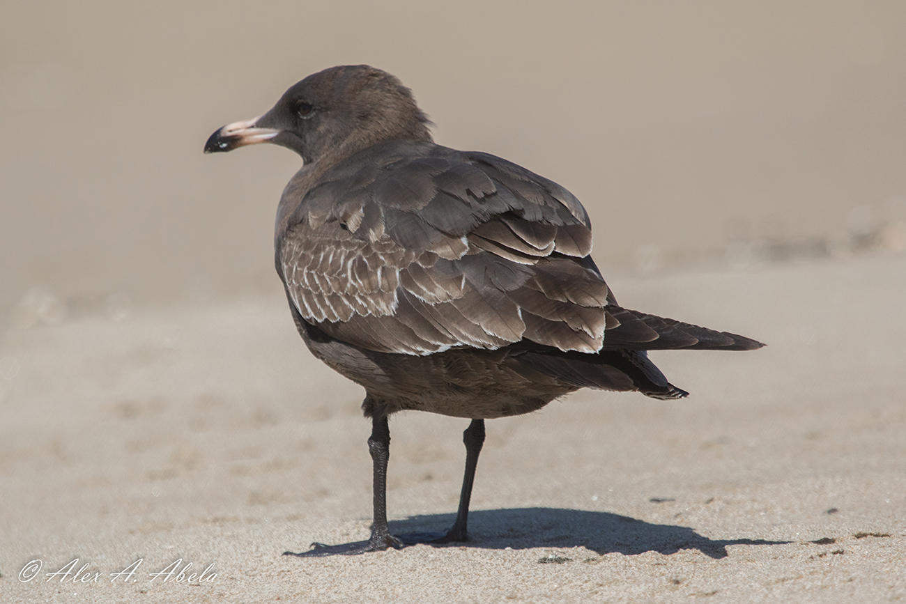 Heermann's Gull heermannii 1st cycle (1CY), September 14 2018, San Luis Obispo, California USA. Picture: Alex Abela.See Alex's Flickr site for many more images, illustrating the plumage development in this species! Juvenile feathers already heavily worn. Obvious moult in scaps but also note 2nd gen dark feathers growing in at ear coverts and side of breast. Several inner wing coverts replaced as well.