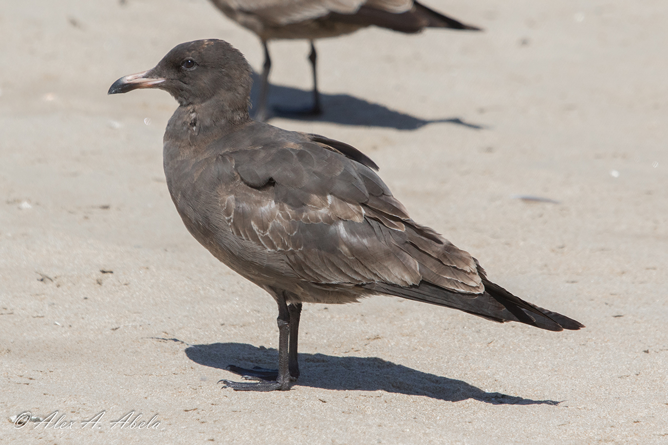 Heermann's Gull heermannii 1st cycle (1CY), September 14 2018, San Luis Obispo, California USA. Picture: Alex Abela.See Alex's Flickr site for many more images, illustrating the plumage development in this species! Juvenile feathers already heavily worn. Obvious moult in scaps but also note 2nd gen dark feathers growing in at ear coverts and side of breast. Several inner wing coverts replaced as well.