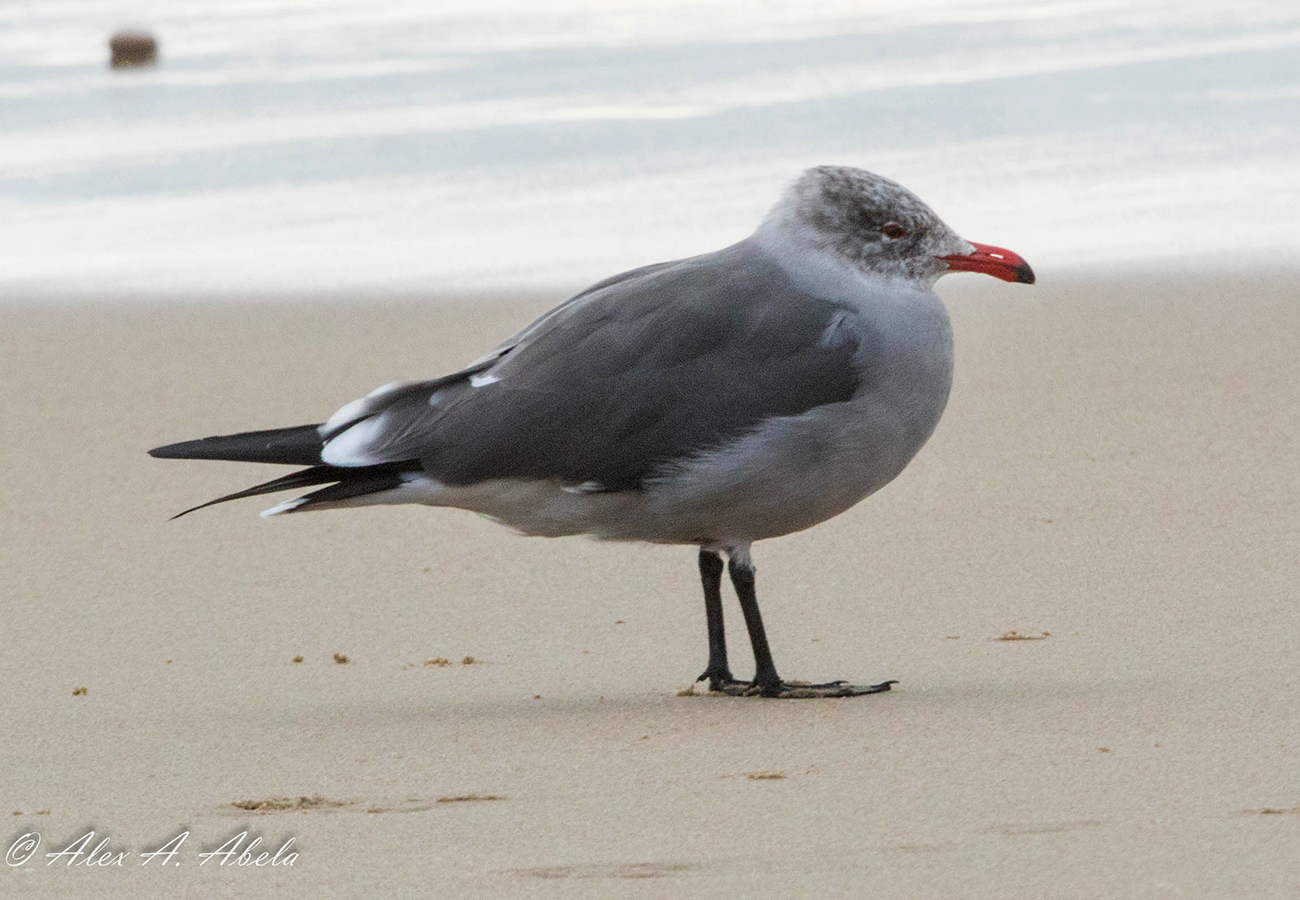 Heermann's Gull heermannii sub-adult?, January 01 2017, Pismo Beach, California USA. Picture: Alex Abela.See Alex's Flickr site for many more images, illustrating the plumage development in this species! Grizzled spotting on head, which is indicative for 3rd cycle birds, not particularly obvious and neck adult-like grey, not brownish. Note small primary tips.