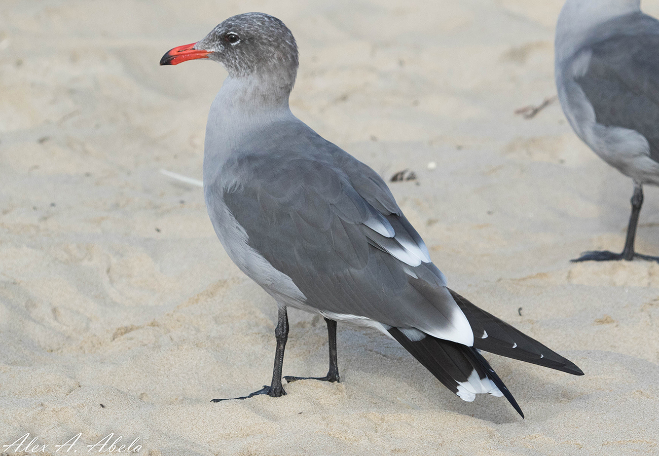 Heermann's Gull heermannii sub-adult, October 08 2017, Pismo Beach, California USA. Picture: Alex Abela.See Alex's Flickr site for many more images, illustrating the plumage development in this species! Note grizzled spotting on head, indicative for 3rd cycle birds, but also note obvious primary spots down to P7 and hindneck not particularly brownish.