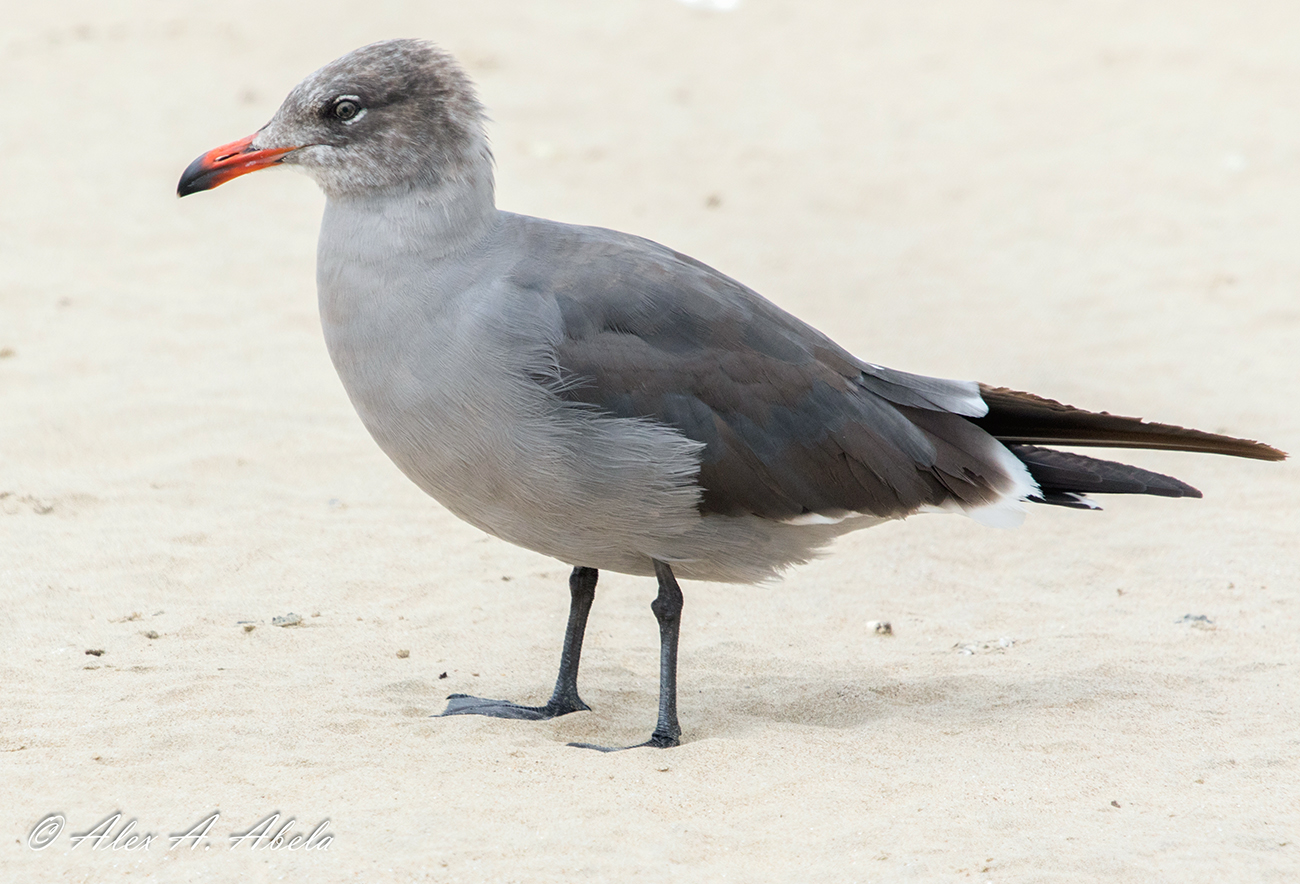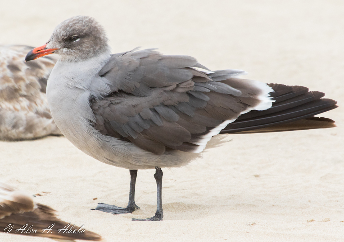 Heermann's Gull heermannii PB4 moult (4CY), May 30 2018, Pismo Beach, California USA. Picture: Alex Abela.See Alex's Flickr site for many more images, illustrating the plumage development in this species. Probably 4th cycle bird, indicated by bold white tips on old secondaries, combined with overall brown head. Note bold white tips on tail-feathers.
