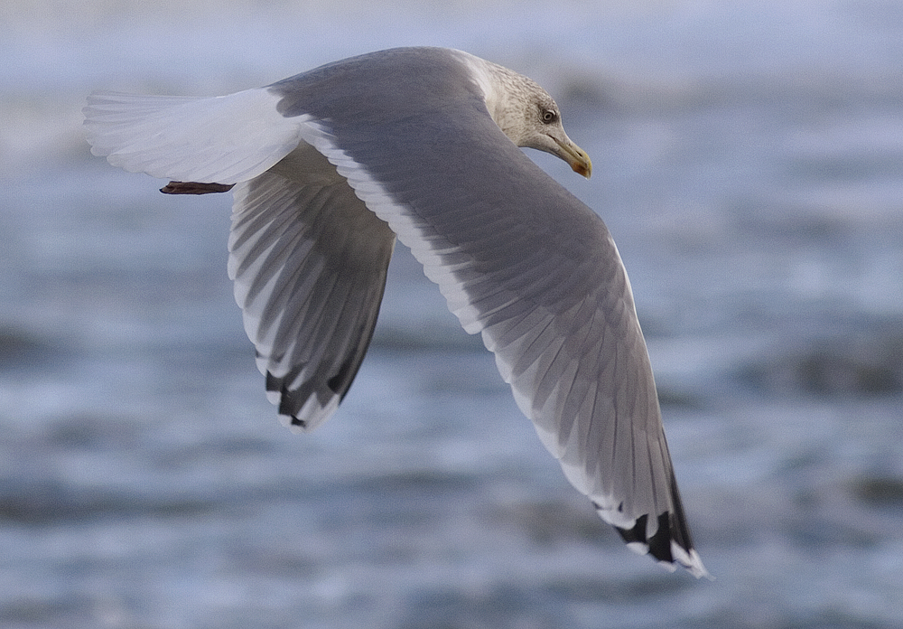 Herring Gull (argentatus) adult, December 02 2012, Katwijk, the Netherlands.Bird not ringed, no provenance on ssp. but head profile and wing-tip pattern are indications. No sub-terminal band on P10, "thayeri" on P9, broken black band on P6, no black on P5.