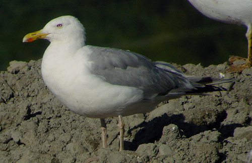 Herring Gull adult (argentatus), August 06 2002, Tampere, Finland (61.31N,23.43E). An adult argentatus, with a pure white tongue. This bird has a coral red orbital ring and a dark cast over the yellow iris. The outer primaries P7-P10 are still old, with the white mirror merges with the tip, without any sign of a sub-terminal band and the medial band reaching to the inner-web's edge over only a short range. This individual is in active complete moult with the outer and central median coverts replaced and inner median and outer greater coverts shed. Note the relatively pale grey upper-parts, as can be found in argentatus from the southern Baltic region. From June to December, adult argentatus