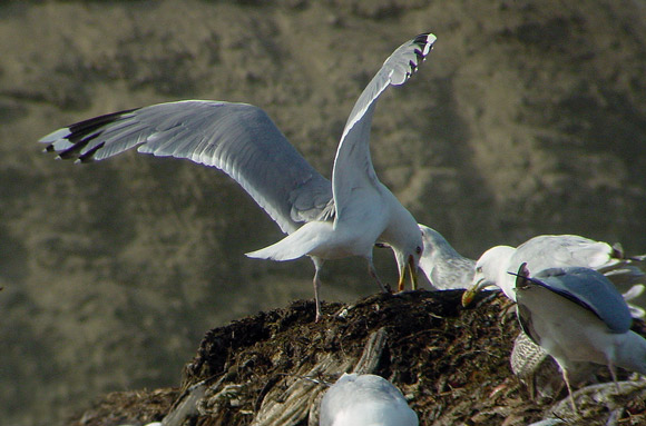 Herring Gull adult (argentatus), August 09 2002, Tampere, Finland (61.31N,23.43E). An adult argentatus, which shows the old outer primaries (P7-P10) and the new inner primaries (P1-P4). Note the plain grey outer greater primary coverts. On P10, the white mirror merges with the tip, without any sign of a sub-terminal band. P9 has a complete black sub-terminal band and the black on P8 and especially P7 is limited compared to West European argenteus. From June to December, adult argentatus