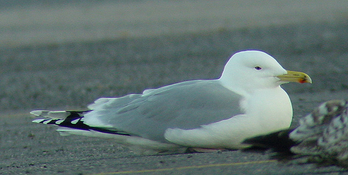 The individual on the picture has the black marking on P5 confined to the outer-web as a single rectangular small black square, with well-defined borders (not diffuse as in most Finnmark birds), not unlike the pattern found in adult Baltic yellow-legged argentatus from the southern East Sea region and which winter in large numbers in north-east Netherlands and along the North Sea coast. The white tip of P10 fully merges with the mirror, without a single sign of a sub-terminal band and the white 'tongue' on the inner-web is broad, almost creating a thayeri pattern on P10. Note the shape of the division line between white tongue and black-sub-terminal band: rather angular, the line reaching the feather edge under an angle; the top not rounded but sharply defined by a straight line. Legs are pale yellow, the orbital ring is intense coral red and the bill is warm yellow with an orange-red gonydeal spot. The bill shows small black markings on both upper and lower mandible. The head, neck and breast are completely snow-white without any streaking, which is not uncommon by January and may be seen already by mid-December. All these features fit the East Sea argentatus Herring Gulls very well. In direct comparison with 4cy Yellow-legged Gull (L. michahellis), it proved to be obvious paler grey, but still darker than surrounding argenteus Herring Gulls. It's pretty hard to pin down the exact geographical origins of this individual, but most features advocate Eastern Poland or a population elsewhere in the Baltic region and it may therefore be a yellow-legged representative of the nominate race argentatus. In some respects it resembles Pontic Gull L. cachinnans, but note the head profile (lacking the slender, long bill and long neck) and especially the P5 pattern, which normally shows a full sub-terminal black band on P5 in cachinnans. In cachinnans this P5 sub-terminal band is broad on both outer and inner-web, contra many argentatus, with a smaller band on the inner-web. However, some cachinnans may show less black on P5. Note also the pattern of the line dividing the grey centre of P10 from the black outer-web. In cachinnans this division line often makes a strong curve and has a smooth straight line, unlike the pattern of Herring Gulls, which often show a "saw-blade" motive or otherwise much irregularities along the division line. Sometimes wear of the outer primaries may be useful as a first indication of origin: note the rather fresh, broad white tips in the picture. An early moulting species as cachinnans would on average show more abrasion in the feathers. The only characteristic difficult to match with argentatus may be the pigmentation (though limited) in the iris. |