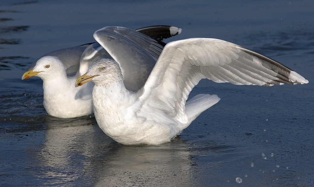 Herring Gull adult, January 23 2013, Katwijk, the Netherlands.Birds with plain grey greater primary coverts are considered full adult. Probably argentatus, with argenteus behind. Bird below with medium pale tongue on P10 and broken sub-terminal band.
