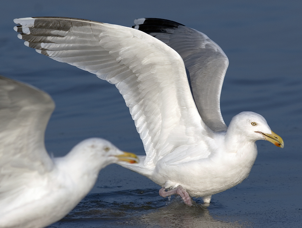 Bird below with short pale tongue on P10 and broken sub-terminal band.