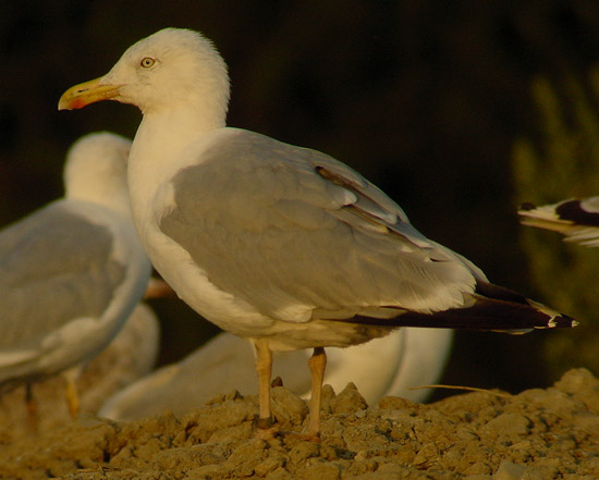 Herring Gull DN 083?? adult (argentatus), August 12 2002, Tampere, Finland (61.31N,23.43E). An adult argentatus, metal-ringed Poland DN 083??, with clear yellow iris, a coral red orbital ring and yellowish-pink legs. This individual is in active complete moult with the outer median coverts replaced and the outer greater coverts shed. The outer primaries P8-P10 are still old. Note the rather pale grey upper-parts. From June to December, adult argentatus