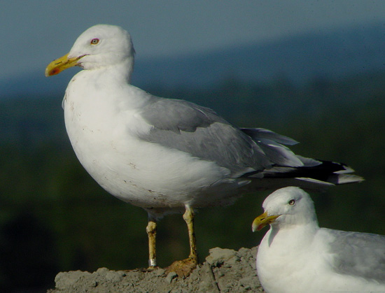 Herring Gull HT-092?72 adult (argentatus), August 06 2002, Tampere, Finland (61.31N,23.43E). An adult argentatus, ringed metal HT-092?72 in Finland. Note the dark hue over the yellow iris and the clear yellow legs. HT-092?72 is in active complete moult with the outer median coverts growing and the outer greater coverts shed. The outer primaries P8-P10 are still old, with a large mirror on P10. This mirror merges with the white tip. P5 is already fully grown and shows a diffuse sub-terminal band on both the inner and outer-web. Note the coral-red orbital ring. From June to December, adult argentatus