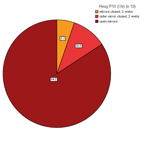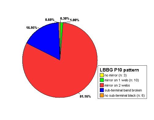 Valery Buzun, in his 2002 article in British Bird about Heuglin's Gull, placed great emphasis on the wing-tip pattern in this taxon. Seasonal timing of our research at Moerdijk doesn't allow firm statements about the exact wing-tip patterns in Dutch Lesser Black-backed Gulls, as many birds show abraded P10 and P9 when breeding. Since the white parts in a wing-tip are more vulnerable to wear and tear as are pigmented parts, we may bias dark birds in our sample when scoring the exact patterns.