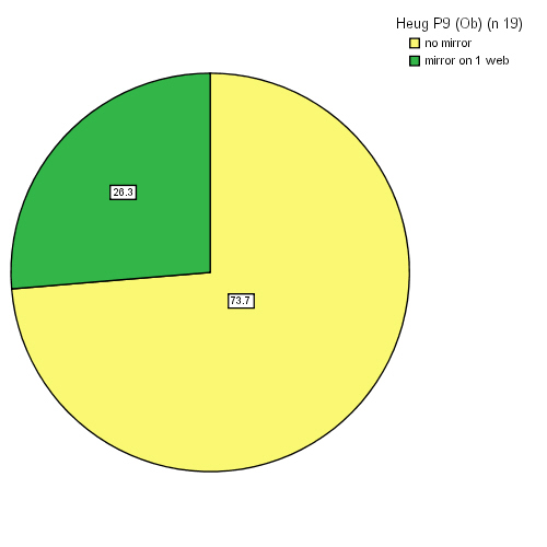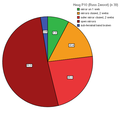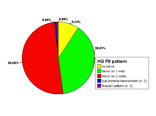 The image above illustrates the problem when scoring wing-tips in May in the Netherlands. Another problem are the differences in scoring classes between Valery's heuglini and our graellsii. And the pies below show the distribution and classification for P10 and P9 used by Valery. His research was done for two regions: one poipulation for the Ob and another population in Russian Zavorot. Valery is more specific in the exact pattern of the mirrors on P9 and P10, as he classifies mirrors as "open" (mirror reaches the edge of the feather) and "closed" (black of the medial band runs down along the feather edge, enclosing the mirror. He only found birds with broken sub-terminal black bands on P10 at the Russian Zavorot. And the distribution for p9 is illustrated below. Obviously, most birds have no mirror on P9. For heuglini, the common pattern would be P9 without a mirror and P10 with open mirrors. This is a common pattern found throughout the Dutch population. But also closed mirrors can be found at Moerdijk. Unfortunately Valery doesn't enlarge upon the exact definition of "closed". Should it be intense black running along the feather edge, or may it turn grey? And when does grey becomes of-white or white so the mirror will be classified "open"? We can not really quantify the portion of Lesser Black-backed Gull at Moerdijk, showing this pattern (due to extensive wear), but below we add two example birds in whichj the mirrors may be called "closed": Below: Lesser Black-backed Gull o4H: