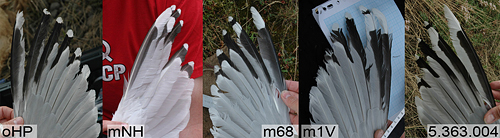 Plate 8. Thayeri patterns in Dutch Herring Gulls oHP, mNH, m68, m1V, NLA 5.363.004 Interesting primary patterns in Herring Gulls include birds showing thayeri patterns on P9 and on P10. This thayeri pattern on P9 is quite common in nominate argentatus from Finnmark (over 20% of the birds, according to Barth (1975). Goethe (1961) scored 160 Herring Gulls from N Germany and found 6 birds with a thayeri pattern on P9 or P10. Adriaens and Mactavish (2004) scored 133 Belgian birds and found one individual with a thayeri pattern. We found five such birds in our sample. Normally, thayeri patterns are associated with limited sub-terminal black markings in the wing tip (e.g. Northern birds with no sub-terminal black marks on P10 or lacking black in P5 or even P6). However, our data show that this is not necessarily the case: e.g. bird mNH has a thayeri pattern on P10 but also shows a near complete black sub-terminal band on this feather (Plate 8). Herring Gull NLA 5.363.004 combines thayeri patterns with a red orbital ring (the only such Herring Gull in our sample), as is commonly found in SE Scandinavia. The origin of NLA 5.363.004 is not known (it was not ringed as pullus), but it has been breeding at Moerdijk over the last five years.