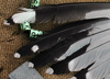 Plate 7. Primary patterns of individual (coded) Lesser Black-backed Gulls. Mirro on P8 in oNL (adult), o65 (12cy) with black on P2-P10, and breeding o32 (4cy) lacking mirrors on P9 and P10. Compared to the taxon heuglini, the average number of primaries with black is lower in graellsii (Buzun BB). About 11.5% (n = 982) of breeding Lesser Black-backed Gulls (sub-adults excluded) have eight or nine primaries with sub-terminal black markings. The mirror on P9 and even P10 may be absent in breeding birds, although the latter was only found in sub-adults, showing other immature features such as dark wing-coverts and tail markings (LBBG o32 Plate 7). The size and number of mirrors and the number of primaries with black pigmentation have at various times been cited as possible field marks that might be useful in separating the various Lesser-black-backed Gull taxa, including heuglini. The variability shown by our Dutch-breeding birds suggests the need for caution when using these elements of primary pattern in field identification.