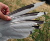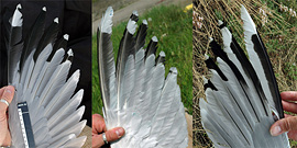 1. Grey tone of upper-parts. Scored 1-20 on Agfa grey scale (which is similar to the Kodak 20 step grey scale) in 0.5 classes. See Goethe (1961) and Jonsson (1998) for discussion of the use of grey scales and measurements. We first scored grey tone in the field (in the shadow) and photographed each bird with the scale held next to its wing, to optimise parallel light conditions for feathers and grey scale simultaneously (see for example plate 7). Data were then validated from the photographs, using Photoshop ‘grey scale’ mode to correct for brown hue and chroma. 2. Black on greater primary coverts. Scored as either present (+) or absent (-). A bird is scored positive only when pigmentation exceeds the width of the shaft. 3. Number of primaries with black pigmentation. Small black sub-terminal spots are included and scored positive. 4. P10 and P9 primary patterns. Following Goethe’s classification, we used six classes to characterise these feathers. I: No mirror. II: Mirror on one web. III: Full sub-terminal black band, mirror on both webs. IV: Sub-terminal black present, but band broken. V: No sub-terminal black, mirror completely merged with tip. VI: ‘Thayeri’ pattern, medial band not reaching the feather-edge of the inner web. For more details, see plate 1 and Goethe (1961).