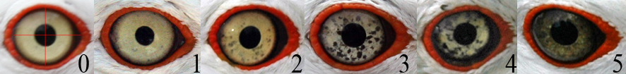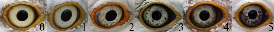 7. Iris speckling. Six classes. 0: No speckling. I: Speckling < 1% of surface. II: Speckling 1-5%. III: Speckling 5-10%. IV: Speckling 10-20%. V: Speckling > 20%. We did not score so-called ‘clouded’ irides, as true black values are not present in such iris markings. See plate 2 for example of birds in each class.