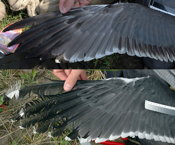 Plate 3. Two example primary covert patterns to illustrate the division between ‘sub-adult’ and ‘adult’ Lesser Black-backed Gulls in our analysis. Left: the greater primary coverts in sub-adult LBBG oHZ show extensive dark centres and diffuse borders. Also note the dark centres on the secondaries and brown-black P9 and P10. Right: LBBG yET with neatly demarcated black markings, which are considered to be still possible in ‘adult’ birds. In fact, LBBG yET was ringed as pullus in June 1995, and now in its 12th calendar year.